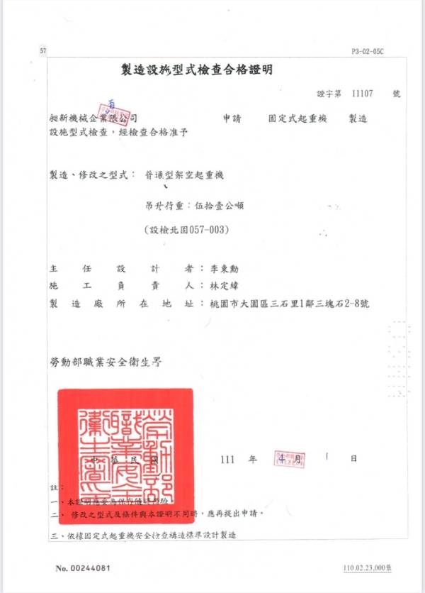 普通型架空起重機-製造許可