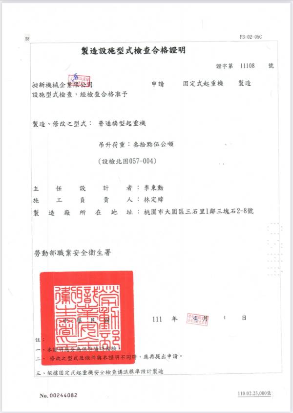 製造設施型式檢查合格證明